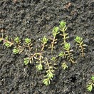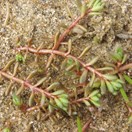 Dioecious perennial terrestrial herb, stems prostrate (rarely erect, forming tight cushions to 70 mm high), branching freely, rooting at nodes, forming clumps to 100 mm in diameter, glabrous. Leaves all opposite, entire, obovoid, 1.8-3.5 × (0.5-)0.7-1.1 mm, ± planar or slightly concave on upper surface, convex below, spreading or slightly upward-curving, glabrous.. Hydathodes absent. Rarely, in inundated plants, submerged leaves are formed, which are linear, 2.0 × 0.2 mm. Inflorescence a terminal spike with the unisexual flowers borne in the axils of opposite upper leaves indistinguishable from lower (sterile) leaves. Male and female flowers apparently borne on separate plants. Bracteoles linear, 0.5-0.7 × 0.1-0.2 mm. Hydathodes 0. Male flowers 4-merous, sessile, usually in axils of the uppermost pair of leaves only. Sepals 0. Petals 4, green at first, becoming white with a dark reddish spot at tip (rarely, completely dark red), hooded, non-unguiculate, 1.5-1.8 × 0.7-1.0 mm, reflexed at anthesis. Stamens 8; filaments 0.2-0.3 mm long, elongating to 0.8-11.0 mm at anthesis; anthers yellow, oblong, 1.2-1.3 × 0.4 mm, 4-celled, non apiculate or very weakly apiculate. Styles 0. Ovary vestigial. Female flowers 4-merous, sessile, in axils of upper 4-8 pairs of leaves. Sepals, petals and stamens 0. Styles 4, ± sessile, stigmas white, fimbriate, capitate. Ovary green, shortly cylindrical, 0.8 × 0.6-0.8 mm, longitudinally channelled between styles, rounded opposite styles, otherwise smooth. Fruit black, depressed-globular, 0.9-1.0 × 1.1-1.4 mm, suture between mericarps buff coloured; mericarps separating at maturity. Mericarps planar on inner faces, outer face convex, smooth or very weakly punctate, sometimes with a faint median longitudinal ridge.