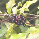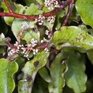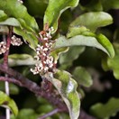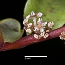 Shrub or small tree up 6 m tall. Trunk stout, 0.2-0.6 m diam. Bark dark black or purple-black, red on younger branches. Branchlets numerous erect to spreading, very leafy. Petioles stout, fleshy, 5 mm long, often red or green mottled red. Leaves 30-60 x 15-25 mm, dark green to yellow-green variously mottled or blotched with red, or purple spots, leathery, glabrous except for finely pubescent mid vein, obovate-oblong to broad-elliptic, apex obtuse, margins entire, strongly undulate, rarely flat. Inflorescence a fascicle, usually numerous and crowded, produced along branchlets and in leaf axils. Fixed female and inconstant male flowers on different plants, 1.5-2.5 mm diam., white, cream or pale green. Pedicels short, stout, dark red or purple-black. Calyx-lobes 4, sometimes heavily reduced, long persistent. Petals 4, lanceolate, obtuse, free, revolute. Fruit a 1-seeded drupe, 2-3 mm diam., purple-black to black when mature.