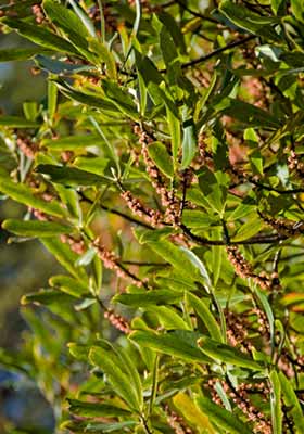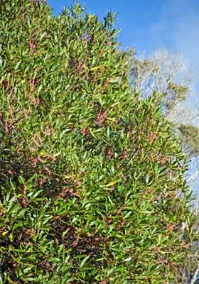 Small upright tree bearing long narrow smooth leaves that are erect and reddish-yellow when young. Leaves 7-18cm long by 2-3cm wide, with a smooth edge. Fruit red to purple, 8-9mm long.