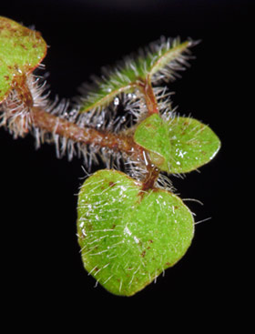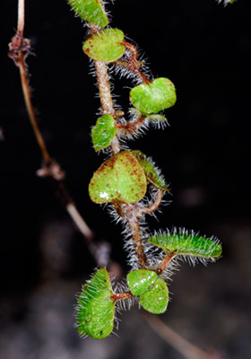 Prostrate hairy herb, openly branched, rooting at nodes. Stems 0.6-1.0 mm diameter with internodes 20-40 mm long, densely hairy when young. Hairs subappressed at first, becoming patent to erect, straight, becoming bent, 3-5-celled, the distal cell tapered to a fine point. Leaves opposite, stipulate, petiolate. Stipule interpetiolar, adnate to base of petiole, broadly triangular, 1.0 × 1.5 mm, undersides hairy when young, becoming membranous. Petiole 4-10mm long, hairy. Lamina broadly ovate-deltoid, 7-15 × 5-13 mm, apex subacute, base truncate, entire, with scattered erect hairs on both surfaces, margins glabrous, rich green above, pale green or purplish below, veins obscure above, clear below, raphides obscure. Flowers bisexual, protogynous, solitary and terminal on short branchlets, sessile, closely subtended by 2 pairs of leaves. Calyx a shallow rim, irregularly lobed, lobes c.0.2 mm long. Corolla funnelform, c. 3 mm long, 4-lobed, lobes ovate, spreading, undersides translucent green with purple flecks, 1 mm long, acute, upper surface hairy, margins papillose. Stamens 4, filaments glabrous, attached to receptacle and adnate to base of corolla tube, anthers yellow, dorsifixed, exserted from corolla. Style bifid, pale green, branches diverging, exserted from corolla. Ovary inferior, 2- celled, with 1 ovule in each cell. Fruit a globose, orange to red, shining, drupe, c. 6 mm diameter, often hairy, pyrenes 2, plano-convex, c.3.5 × 2.5 mm.