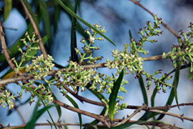 Tree bearing pairs of dark green very narrow smooth leaves that are pale green underneath. Leaves 4-7cm long by 0.5cm wide. Fruit red, 6-9mm long, containing a single seed.