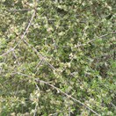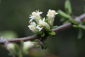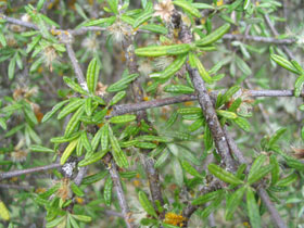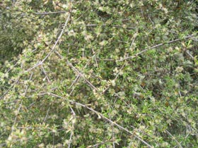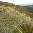 Bushy greyish shrub with wide-angled interlacing reddish twigs bearing wrinkled narrow rolled leaves that are white underneath inhabiting wet places in eastern South Island. Leaves 5-12mm long by 0.5-2mm wide. Flowers small, white. Seeds fluffy.