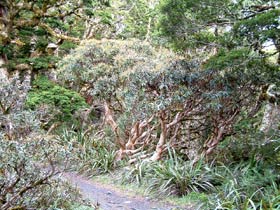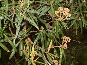 Small tree bearing many long narrow wrinkled leathery leaves that have a down-turned margin and rusty fuzzy underneath inhabiting upland areas. Bark flaking in long thin strips. Leaves 7.5-17cm long by 1-2.5cm wide (widest in South Island). Flowers white with yellow centre, in clusters. Seeds fluffy.