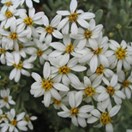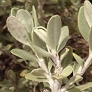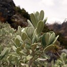 Greyish shrub bearing grey-green thick oval leaves that are fuzzy on both surfaces (particularly when young) inhabiting subalpine areas south from Arthurs Pass. Leaves 10-20mm long by 4-8mm wide, musky smelling. Flowers white with yellow centre, in small clusters. Seeds fluffy.
