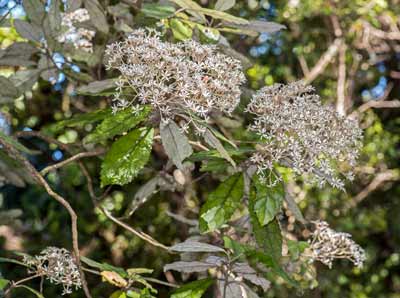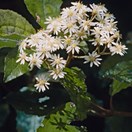 Small tree bearing thin toothed oval leaves that are white underneath and with the vein network easily visible inhabiting forests from the Coromandel south to the Buller River. Leaves 9-15 cm by 3-7cm wide. Flowers white, body fuzzy, in a loose spray. Seeds fluffy.