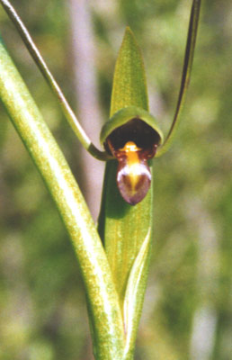 Terrestrial, usually solitary, glabrous, perennial tuberous herb. Plant at flowering up to 900 mm tall. Tuber up to 50 x 10 mm ovoid, ovoid-ellipsoid. Stem fleshy dark green, red-green, to brown-green, stiffly erect, rather wiry, axis of raceme usually flexuous. Leaves fleshy, suberect to spreading, 10-20 x 3-6 mm, dark green, dark red-green to brown-green, basal third closely sheathing, linear-lanceolate to linear, channelled, apex acute. Inflorescence racemose up to 200 mm long and 2-12-flowered; flowers more or less equidistant subtended by closely sheathing leaf-like bracts. Perianth colour variable, mostly green or red-green, sometimes greenish-yellow. Dorsal sepal uppermost, 10-15 x 9-14 mm, very broad, and arched over column, distinctly cucullate and deeply concave, subacute; lateral sepals 20-50 mm long, 0.5 mm diameter, narrow-linear, semi-terete, channelled, erect to divergent. Petals very short, narrow-oblong, flat, apex mostly notched, occasionally entire, more or less hidden under dorsal sepal. Labellum spreading, deflexed, firmly fleshy to almost coriaceous, green, red-green, yellow or black, trilobed, margins smooth, lateral lobes broad, oblique; mid-lobe larger, ovate; median callus yellow, restricted to near base, shortly conical with a thickened inturned, rounded apex, base of mid-lobe usually bearing two small calli. Column short, column-wings present as two lateral, linear processes, more or less papillose. almost as long as anther. Anther dorsal, taller than stigma, pollinia ill-defined, pollen granular. Stigma disc-shaped; rostellum prominent, acute.
