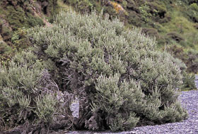 Grey or yellow-green bushy shrub with very short (<3mm long) narrow leaves inhabiting open areas and disturbed sites. Flowers white, body of papery scales, in tight clusters at tip of branches. Seeds fuzzy.