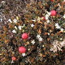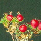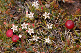 Very low growing patches to 0.5m wide with many very small hard blue-green leaves that have a finely hairy edge (lens needed) and red fruit inhabiting upland areas. New growth reddish. Leaves 3-5mm long by 1-2mm wide, blunt tipped. Flowers white, tubular.