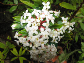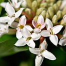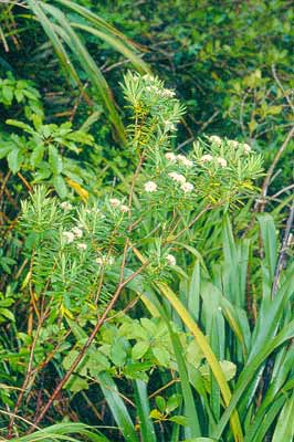 A much-branched, erect shrub up to 2 m tall. Branches and branchlets ascending, glabrous except at leaf axils and on receptacles. Node buttresses occupy whole internode, smooth, brown, sometimes prominent after leaf fall on small specimens; internodes 8–14 mm long. Bark ages to grey. Leaves decussate, in distant opposite pairs, ascending to patent or deflexed, on petioles 3–5 mm long. Lamina medium green, yellow-green to dark green, stiff, somewhat leathery, very variable in size and shape on the same plant; largest 40–110 × 10–22 mm, elliptic or ovate, sometimes obovate, oblong or lanceolate; flat, acuminate, base cuneate. Margins slightly thickened and down-turned; midvein prominent abaxially, sunken above; lateral vein pattern camptodromus; stomata on undersides only. Inflorescences many-flowered; pedicels 1–2 mm long, persistent. Involucral bracts four, smaller than or sometimes the same size as largest ordinary leaves (20–40 × 8–10 mm). Plants gynodioecious. Flowers hairy on outside; inside hairless; fragrant, white, flushed rose or completely pink, lower tube often red. Calyx lobes open in salverform fashion. Female tube to 10 mm long, ovary portion 4 mm, calyx lobes 3.2 × 1.8 mm; staminodes short, at mouth of tube. Female tube to 15 mm long, ovary portion 3.5 mm, calyx lobes 5 × 2.5 mm. Anther filaments long, inserted at mouth of tube; anthers yellow. Ovary densely hairy at summit. Fruits ovoid, green, drying brown, 5 mm long. Seeds narrow ovoid, 4.0 ×1.8 mm. Dried hypanthia persistant often dispersing with fruits inside.