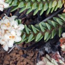 Very low-growing sprawling shrub with densely white-hairy twigs bearing clustered pairs of thick blue-green leaves, hairy white flowers and white fruit inhabiting coastal areas south to Nelson. Leaves 3-6mm long by 2-3mm, underside shiny.