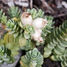 300 mm long. Branching notably sympodial with some laterals. Branchlets densely covered by matted white hair. Internodes 1–3 mm long. Older stems slightly hairy, grey-brown. Node buttresses smooth, black, lunate, masked by hair on young stems. Leaves decussate but usually distichously arranged, ascendant on youngest branchlets, patent later. Lamina 3–6 × 2–3 mm, thick, narrow-elliptic to ovate, flat or slightly keeled. Tip usually obtuse. Stomata abundant adaxially, none or rare abaxially. Abaxial surface glistens. Inflorescences 5–7-flowered compact, receptacles very hairy. Involucral bracts 4, similar in size to adjacent leaves. Plants gynodioecious. Flowers small, white, outside very hairy, inside sparsely hairy in upper tube. Calyx lobes opening in salverform fashion or ascendant. Female tube 1.8 mm long, ovary portion wrinkled, 1.5 mm, calyx lobes 1.2 × 1 mm. hermaphrodite tube 3.8 mm long, ovary portion 2.5 mm, calyx lobes 2 × 1.5 mm. Anther dehiscence semi-latrorse. Ovary with a tuft of long hair on summit. Fruits white, fleshy, opaque 5 × 3.5 mm. Seeds broad ovoid 3 × 1.8 mm.