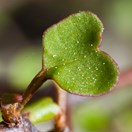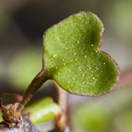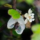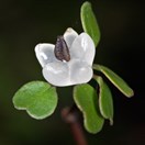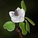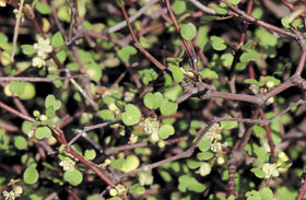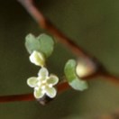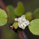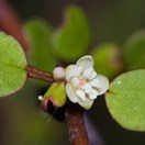Rare brownish shrub with tangled zig-zagging branches bearing small heart shaped leaves and white fruit with a black seed on top. Twigs orange. Leaves 2-15mm wide, with large dent at tip, on a 3-10mm long often brown grooved stalk, in clusters. Flowers small.