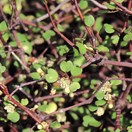 Deciduous, gynodioecious shrub forming dense, interwoven masses up to 4 x 4 m. Stems 10-20 mm diam., maroon-black, cane-like, numerous, arising from a stout, woody, rootstock, 0.5-1 m diam. Branches numerous. Branchlets slender, flexuous, divaricating and interlacing. Leaves in fascicles of 2-5 on short branchlets, or widely spaced along elongated emergent branchlets; petiole slender 3-10 mm; leaf lamina 2-15 mm diam., broadly-obcordate, rarely pandurate or entire; apex usually notched 1(-4) times, cuneately narrow to base. Flowers green or white, on short, axillary fascicles. Male and perfect flowers present on the same plant, the male flower bearing 8 functional stamens, and a rudimentary gynoecium; perfect flowers with functional stamens and gynoecium; female flowers on separate plants, ovary bluntly trigonous; stigmas 3, fimbriate, androecium rudimentary. Fruit an exposed 2-2.5 x 1.25 mm trigonous, dull black rugose nut; surrounding tepals white, succulent.