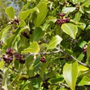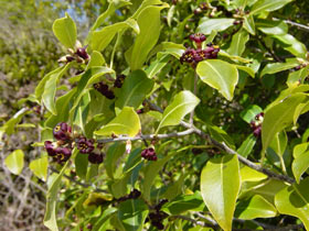 Small tree bearing many flat even green leathery oval leaves that are paler underneath. Leaves 4-10cm long by 2-5cm wide. Flowers dark purple, star-shapeed. Fruit 12mm wide, a hard capsule which splits into three to show black seeds in a sticky pith.