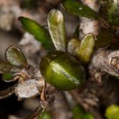 Hard shrub with thick wide-angled pale branches bearing small leathery leaves of two forms on the same plant: smooth oval leaves and deeply-lobed leaves. Flowers dark red, inconspicuous. Fruit a capsule splitting into two rough-surfaced halves to show the 2-6 black seeds.