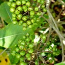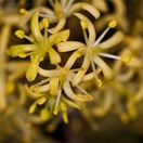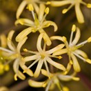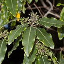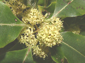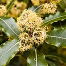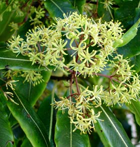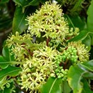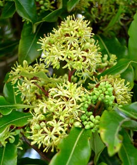 Gynodioecious tree up to 12 m tall but usually much less. Trunk 0.6-1 m diam, stout, clad in persistent pale-grey bark, branches numerous, erect then spreading. Leaf buds sticky, resinous. Leaves borne on slender petioles 10-20 mm long, alternate, 50-100(-150) x 25-40 mm, yellow-green, green, more or less blotched and mottled with paler green or yellow-green (sometimes white), somewhat leathery, glossy, smelling strongly when crushed of ivy or resin, elliptic to elliptic-oblong, apex acute to subacute; leaf margin undulate (very rarely not so), midrib pale green. Inflorescences terminal, numerous, subcorymbose compound umbels. Flowers pale yellow to yellow, very fragrant. Peduncles 10-20 mm, pedicels 5 mm, both sparsely hairy. Sepals 2 mm, ovate to narrow-ovate, pale caducous. Petals 5, 5-7 mm long, narrow-oblong. Capsules 2-valved (rarely 3), 5-6 mm, ovoid to elliptic, caducous, seeds immersed in dark yellow viscid pulp, whole structure covered in long persistent papery endocarp.