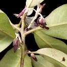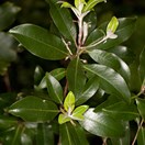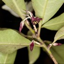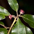 Small tree with silvery fuzzy young parts and dark green shiny leathery leaves that are paler underneath and 1.5-2cm wide capsules. Flowers red, with silvery fuzzy base. fruit splitting into three to show the black seeds in a yellowish pith.