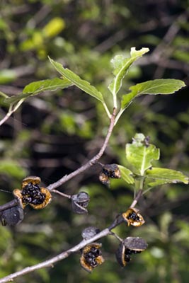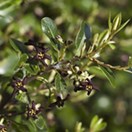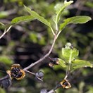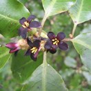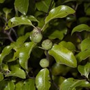 Small tree with very dark twigs bearing pale green shiny wavy thin leaves and very dark flowers and 12mm wide capsules that split into two or three to show the black sticky seeds. Leaves usually 2-4cm long.