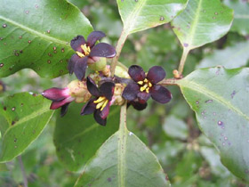 Shrub or small gynodioecious tree up to 10 m tall (usually much less). Trunk 0.3-0.4(-0.6) m diam., stout, clad in dark grey-black or brown persistent bark. Branches numerous, erect then spreading. Branchlets and young leaves pubescent, hairs pale yellow or cream. Petioles short, somewhat fleshy. Leaves alternate, (10-)30(-70) x (5-)10(-20) mm, leathery, pale-green to dark green above, lighter below, oblong, oblong-ovate or elliptic-obovate, apex obtuse to acute, rarely acuminate, margins entire, often undulose. Flowers solitary or in axillary cymes, rather fragrant, especially at night. Pedicels stout, pale green, fleshy, bracts entire, lanceolate, caducous. Sepals narrowly ovate-oblong, subacute to obtuse, silky hairy. Petals 12 mm long, lanceolate, dark red, black (rarely yellow or white). Capsules 2-valved (rarely 3), subglobose, valves woody, black when mature, long persistent. Seeds immersed in sticky, red or yellow viscid pulp.