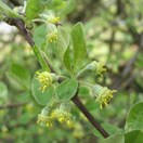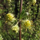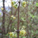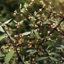 Rare small-leaved shrub with wide-angled grooved reddish stems bearing clusters of thin grey-green leaves inhabiting river valleys of the eastern South Island. Leaves 20-50mm long by 5-20mm wide. Flowers small, yellowish, on drooping 15mm long stalks, in small groups at base of leaves. Seeds fuzzy.