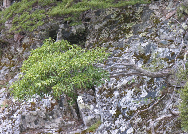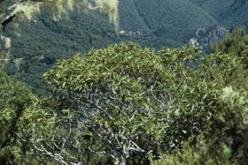 Silver beech (Nothofagus menziesii (Hook.f.) Oerst.) forest and subalpine scrub. Most (if not all) current occurrences are on or near cliff faces or walking tracks, locations less prone to the influence of browsing animals.