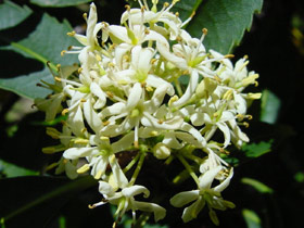 A very distinctive species, immediately recognised by the dark purple-black or reddish-purple stems, rather broad, lanceolate, dark brown green toothed leaves, and profuse clusters of creamy white flowers.
