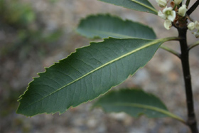 Small tree with dark twigs bearing leathery leaves with teeth along the upper half of the margin, clusters of cream flowers and hard capsules inhabiting Northwest Nelson. Capsules 12mm long, longer than wide, splitting into two to show the black sticky seeds in a orange pith.