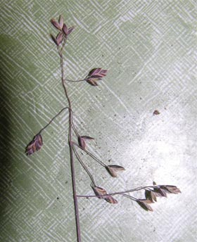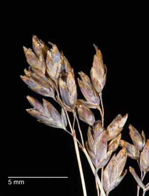 Similar to Poa lindsayi, which has the hairs on the lemma extending further towards the tip. The spikes are usually held futher above the leaves and on longer branchlets giving a more delciate appearance. The leaves of P. tonsa can also be folded in a similar fashion to P. lindsayi, but are wider and with a distinctly curved tip. The leaves of P. lindsayi are coloured green or brown, those of P. tonsa are frequently a glacuous-purple