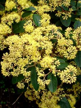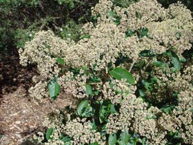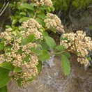 Shrub rarely reaching 4m tall with fuzzy twigs bearing wrinkled blunt-tipped leaves that have very prominent veins on the brownish underside. Leaves 6cm long by 3cm wide, with brownish star-shaped hairs underneath. Flowers pale yellow, in dense round clusters. Fruit dry, small.