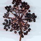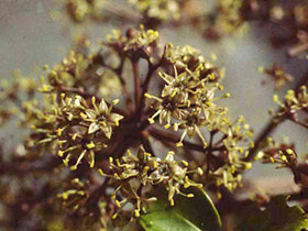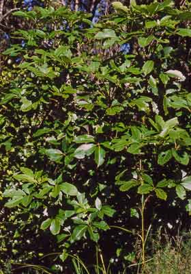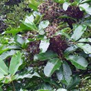 Us. Dioecious. Small multi-branched tree to 8 m tall, branches and branchlets brittle. Leaves alternate, leaflets 5-7 (us. 5), palmate. Petioles c. 15-20 cm long, sheathing branchlet at base. Petiolules c. 3-5 cm long, pale green. Leaflets obovate-oblong to oblong-cuneate, thinly coriaceous, coarsely serrate-dentate, acute or acuminate to obtuse; midveins and main lateral veins obvious above and below; teminal lamina 10-20 x 4-7 cm. Inflorescence and panicle, terminal, compound; flowers usually unisexual; 8-20 primary rays (branchlets), up to 10 cm long; 15-20 secondary rays; umbellules with 10-15 flowers in each. Calyx truncate or obscurely 5-toothed; flowers c. 5 mm diam., sweet-scented; petals 5, white to pink flushed, ovate to triangular, acute; stamens 5, obvious, filaments c. = petals; ovary 2-loculed, each containing 1(-2) ovules; style branches 2, spreading. Fruit fleshy, 5-8 mm diam., style branches retained on an apical disc, very dark purple, laterally compressed. Seeds 2(-3) per fruit, wrinkled, 3-6 mm long.