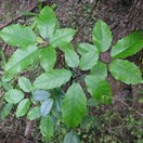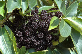 Small bushy tree with glossy green fleshy toothed leaves arranged in fans of 5 (occ. up to 7) leaflets. Fruit purple, in obvious clusters
