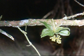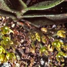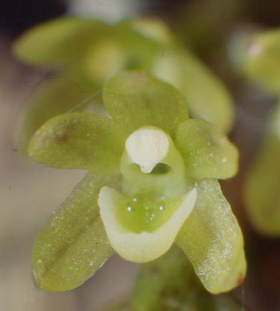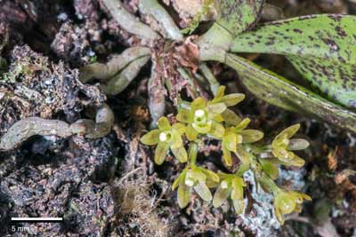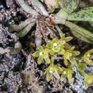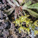 Diminutive epiphyte of trunks and branches relatively clean of other epiphytic plants. Occasionally found on rock outcrops and cliff faces. Forming branched, leafy, tufts (20-)30-60(-80) mm diameter, with many white to brown, cord-like roots firmly attached to substrate. Leaves (10-)30-50(-70) x (5-)15(-20) mm, green or yellowish green, frequently purple spotted, leathery, elliptic to lanceolate, with acute often twisted tips. Inflorescences racemose, one or more per stem, up to 50 mm long, bearing (1-)2-6(-10) flowers. Flowers at first yellowish-green flecked with purple, maturing yellow. Sepals and petals subequal, spreading widely but projecting forwards and inwards to form a cup. Dorsal sepal 3.5-4 x 1.5 mm, lateral sepals shorter, petals 2.5-3 x 1.5 mm. Labellum 2 x 1.8 mm, projected forwards, immobile, concave, channelled, apex thickened, fleshy, clear yellow, lacking distal lamina calli. Capsule 15 x 5 mm, fusiform, yellowish green and purple spotted.