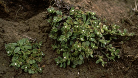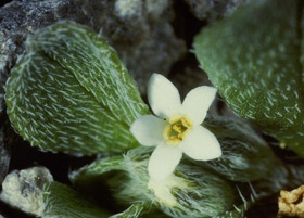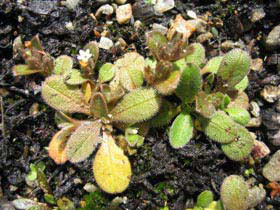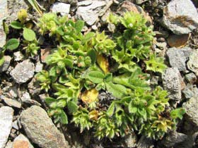 Ground hugging rosette herb in 1cm to several cm clumps. Lateral branched few to many, prostrate, up to 9cm long. Leaves oval to spoon-shaped; upper surface hairy except towards base, lower surface almost hairless. Leaf hairs stiff and spreading. Flowers white to cream, 3mm diameter.