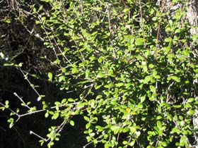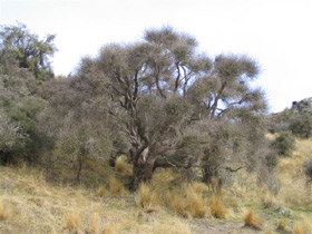 Rare small tree bearing many erect branches that are squareish in cross-section and with clusters of dark green leaves that are white underneath inhabiting eastern South Island valleys. Leaves 10-17mm long by 4-6mm wide. Flowers small, body has hair-edged scales (lens needed). Seeds fluffy.