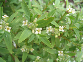Pimelea prostrata is a common component of coastal cliffs and shrubland vegetation. It has several variable forms but the leaves are smaller (3 to 6 byƒn1 to 3 mm) than of P. tomentosa, its habit prostrate to sprawling and it has smaller, less conspicuous white fleshy fruits. Sand daphne (Pimelea arenaria) has a similar habit but only occurs in dunes and dune hollows, has shorter, more rounded leaves than P. tomentosa and smaller red fruits.