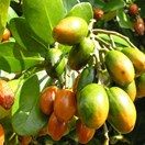 Large tree about as wide as tall with many thick dark green glossy leaves and large oval orange fruit. Bark dark, with dark spots on trunk. Leaves 10-20cm long, paler underneath. Fruit to 4cm long, oval, in dense sprays, flesh thin.