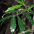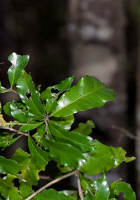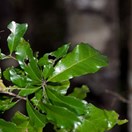 Small tree bearing a variety of shapes of dark green glossy leaves (that are sometimes in pairs) paler underneath with small dots inhabiting the North Island. Leaves narrow and thin or rounded, to 12cm long. Flowers small. Fruit red, in small clsuters at base of leaves.