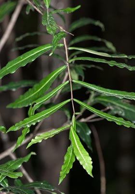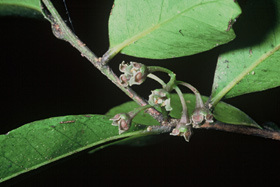 Small hemiparasitic, glabrescent to glabrous tree up to 6 m tall, bark smooth, grey to grey-black, branchlets slender, brittle. Petioles slender, short, somewhat fleshy. Leaves mostly alternate, sometimes with a few subopposite to opposite, (50-)100(-120) x (10-) 20-30(-40) mm, upper surface dark green to yellow green, very glossy, undersides paler and mat, lamina variable in shape ranging from linear, narrow-lanceolate, ovate to oblong-ovate, broad-elliptic to rhomboid, with all types occasionally present on the same individual, acute, subacuminate to acuminate, somewhat papery, membranous or semi-coriaceous, margins entire, sinuate or distinctly "scalloped". Inflorescence and axillary, few-flowered raceme. Flowers gynodioecious. Pedicels c. 5 mm. Flowers greenish, pink or red. Tepals (4-)5(-6), broadly triangular, caducous, stamens (4-)5(-6), subtended by small hair tufts, disc (4-)5(-6) lobed, stigma 2-4-lobed. Fruit 7-12 x 6-8 mm, narrow-turbinate, bright red, receptacle rim persistent. Description adapted from Allan (1961).