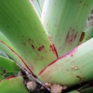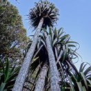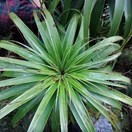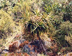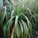 Small shrub or tree bearing a robust tuft of thick grass-like leaves at tip of the usually single trunk inhabiting mountains in Fiordland and central Westland. Leaves reddish at tips, 40-70cm long by 4-5cm at widest point, tip often curled. Flowers in a robust dense spike from under the leaf tufts.