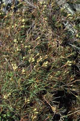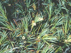 Low-growing sprawling shrub bearing erect tufts of blue-green narrow tapering leaves inhabiting West Coast mountains. Leaves 42-60mm x 4-5mm at widest point. Flowers tubular, mixed in leaves at base of leaf tufts. Fruit a dry capsule.