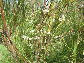 Erect grassy shrub with light grey bark and many erect twigs bearing long very narrow pointed leaves in habiting the northern North Island. Leaves 3-11cm long by 1mm wide, abruptly widening to a sheath that encloses stem and with a small patch of tiny hairs at the base (lens needed).