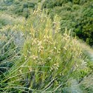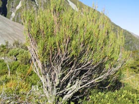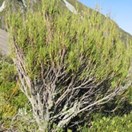 Erect grassy shrub with light grey bark and erect twigs bearing long narrow pointed leaves inhabiting the South Island and Subantarctic Islands. Leaves 4-14cm long by 1-4mm wide, widening to a sheath that encloses the stem which has a finely hairy margin (lens needed).