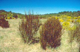 Erect grassy shrub with many thin twigs bearing narrow grass-like wavy leaves inhabiting the central North Island. Leaves 10-48mm long by 0.5-1.2mm wide. Flowers white, in short (less than 13mm long) clusters of 2-4 flowers at the end of twigs.