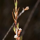 A multi–stemmed shrub 0.3–2.0 m tall. Branches: bark on old branches grey, smooth, young stems reddish to purplish brown. Leaves dimorphic. Juvenile leaves spirally arranged along branches, spreading; lamina sheath 4.5–6.5 × 2.5–3.0 mm, shoulders truncate to auricled and margin membranous with the upper half ciliate; lamina 18–45 × 1–2 mm, linear to rarely linear–triangular, adaxial surface with a patch of scabrid hairs at base; margins serrulate with 70–80 teeth per 10 mm. Adult leaves erect to spreading, olive to dark green; lamina sheath 2.5–6.5 × 2.0–4.0 mm, subcoriaceous, shoulders rounded to auricled and margins membranous, ciliate; lamina 10.0–48.0 × 0.5–1.2 mm, linear to linear–subulate, surfaces glabrous with a tuft of scabrid hairs at base on adaxial surface; margins serrulate with 90–120 teeth per 10 mm; apex triquetrous. Inflorescence a terminal spike on lateral branches; shorter than leaves, erect, dense, 5.3–12.3 mm long, linear–oblong; inflorescence bract over-topping flowers, 4–6 × 0.5–0.6 mm, ovate–lanceolate at base; margins serrulate. Flowers 2–6, sessile; flower bracts equaling to longer than flowers, foliose, 3.5–7.8 × 1.7–2.0 mm, broadly ovate, with a tuft of scabrid hairs at the apex; margins with a prominent broad and white margin, serrulate. Sepals 2.6–3.2 × 0.6–1.2 mm, lanceolate to ovate–lanceolate, longer than corolla tube; adaxial surface pubescent or only the top half pubescent; margins ciliate. Corolla white to light pink; corolla tube 1.8–2.0 × 1.0–1.2 mm, cylindrical; corolla lobes spreading horizontally to reflexed, 1.0–1.5 × 0.8–1.0 mm, triangular, shorter than corolla tube; apices acute; adaxial surface papillate. Stamens inserted in corolla tube in the upper third, filaments 0.1–0.2 mm long; anthers included, rectangular, light yellow and 0.7–0.8 mm long. Ovary obovate, 0.8–1.0 mm long and wide, apex truncate; nectary scales 0.4–0.5 × 0.3–0.4 mm, rectangular, apices retuse; style included, 0.5–1.0 mm long, glabrous; stigma clavate. Fruit 2.9–3.0 × 1.7–1.8 mm, oblong; apex truncate, glabrous. Seeds 1.0–1.2 mm long, yellowish brown, filiform, testa prominently reticulate