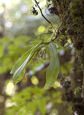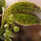 Conspicuous tufted epiphyte of trunks and branches relatively clean of other epiphytic plants. Occasionally found on rock outcrops and cliff faces. Forming branched, leafy, tufts (40-)120(-150) mm diameter, with many white to brown, cord-like roots firmly attached to substrate. Lower parts covered in old leaf and inflorescence bases. Leaves (40-)60(-90) x 15-20(-30) mm, dark green, occasionally purple spotted, fleshy, elliptic, oblong, elliptic-oblong, with obtuse to emarginate, flat or twisted apices. Inflorescences racemose arising from or below the leaves, usually several per season; up to 80 mm long, bearing (1-)6(-20) flowers. Flowers at green or greenish-white, flecked with red, maroon or purple. Sepals and petals subequal, spreading widely but projecting forwards and inwards to form a cup. Dorsal sepal 3.5-4.5 x 1.5-2.0 mm, lateral sepals shorter, petals 2.5-3.5 x 1.5-1.8 mm. Labellum 2.5 x 2.0 mm, projected forwards, immobile, cupular, deeply channelled, mid-lobe evident only as a cucullate apex; lateral lobes forming sides of clog-shaped structure and each furnished with an internally projecting, partly transverse ridge, distal portion distinctly thickened, fleshy, bearing two prominent upright, flattened calli. Capsule 20 x 6 mm, broadly cylindrical to fusiform, green, usually without spots.
