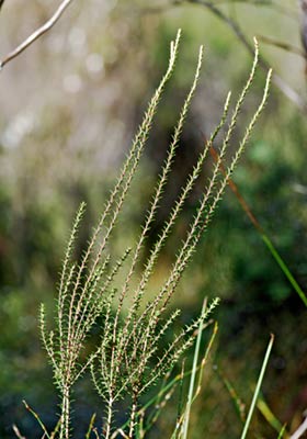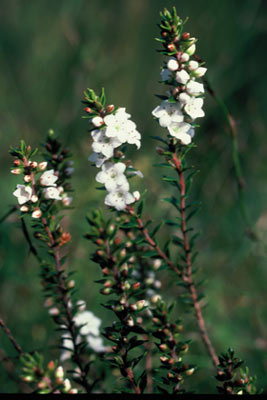 Bushy woody shrub with erect branches covered in small hard leaves 4-7mm long and a small dry capsule inhabiting shrublands. Twigs covered in small hairs. Leaves distinctly widest at middle, with three darker green lines on underside. Flowers white, solitary in the base of leaves but many per twig.