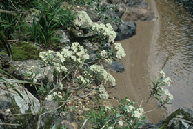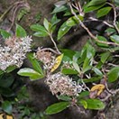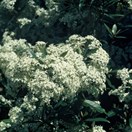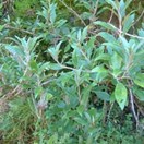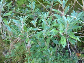 Bushy shrub bearing narrow pointed thin leathery dark green leaves that have an uneven edge inhabiting lowland stream margins. Twigs with a groove along the upper side. Leaves 5-9cm long by 2-3cm wide. Flowers white, in a loose cluster, body nearly 1cm long.