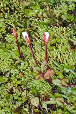 Dense, creeping, mat-forming perennial herb of sodden ground, the stems 20-200 mm long, creeping and rooting below; stems pubescent all round with short bristly hairs. Leaves usually crowded and overlapping or shorter than the internodes they subtend, opposite, with the uppermost occasionally alternate, bright yellowish-green, not shining, paler and occasionally slightly glaucous beneath, the lateral veins not obvious, 2-3 on each side of the midrib, elliptic to narrowly ovate, acuminate at the apex, obtuse to acute at the base, 6-15 × 3-8 mm, entire or very obscurely denticulate with c.2-4 minute teeth along each margin; petioles 2-3 mm long, distinct. Flowers arising individually from the axils of the leaves. Ovaries 15-20 mm long, glabrous or sparsely clothed with short erect hairs, often purplish, on a pedicel 5-25 mm long. Floral tube 1.3-2.0 × 1.5-2.2 mm. Sepals 3.0-6.0 × 1.3-1.8 mm, often tinged purple, not keeled, chartaceous, membranous, glabrous or sparsely invested with short erect hairs. Petals 6.5-12.0 × 4.0-8.0 mm, notch 1.5-3.0 mm deep, white, very rarely flushed pink initially but flushing pink after pollination. Stamens filaments white, of two types: long (2.5-5.0 mm long) and short (1-3 mm long), Anthers 0.9-1.0 × 0.4-0.5 mm,bright yellow. Style 4.5-9.0 mm long, white but purplish near the base, stigma 1.2-2.7 x 0.7-1.6 mm, broadly clavate, held above anthers in early anthesis. Capsule 30-65 mm long, stout, glabrous, on a pedicel 10-120 mm long. Seeds 0.5-1.0 mm long, orange to orange-brown, oblong-obovate, elliptic-obovate or obovate, finely reticulate; coma 7.5-11.0 mm long, orange to orange-brown; coma 2.5-7.0 mm long, white, usually persistent.