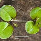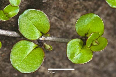 Loosely matted, creeping perennial herb forming patches up to 1 m diameter; stems pale purplish, with strigulose hairs running down the lines decurrent from the margins of the petioles. Flowers arising individually from the leaf axils, the stems continuing to grow and root beyond the point where flowers are produced. Leaves opposite, membranous, yellowish-green, usually with red margins and 1-3(-4) inconspicuous lateral veins on either side of the midrib; lamina 3.0-13.0 × 3-11.0 mm, broadly ovate to oblate, obtuse or rounded at apex, rounded to truncate at base, margins remotely and shallowly serrulate with 2-11 teeth on either side; petiole distinct, 1-7 mm long. Flowers nodding, falling before full pedicel elongation is achieved. Ovaries densely grey-strigulose, 6-15-20 mm long, on a strigulose pedicel 7-35 mm long. Floral tube 0.4-1.1 mm deep, 0.6-11 mm diameter, sparsely strigulose without. Sepals not keeled, sparsely strigulose, 1.7-2.1 × 0.4-0.9 mm. Petals white, 1.9-3.4 × 1.7-2.1 mm, notch 0.6-0.8 mm deep. Anthers yellow, 0.5-0.6 × 0.3-0.4 mm, filaments of longer stamens 0.9-1.3 mm long, those of shorter 0.4-1.0 mm, both shedding pollen directly onto stigma at or before anthesis. Style white 1.0-1.5 mm long; stigma white, clavate, 1.0-1.8 × 0.5-0.7 mm, surrounded by anthers at anthesis. Capsule densely grey-strigulose, (10-)15-40 mm long, borne on a strigulose pedicel 23-130 mm long. Seeds brown, 0.7-1.0 × 0.2-0.4 mm, obovoid. minutely papillose; coma 4.0-5.5. mm long, readily detaching or persistent.