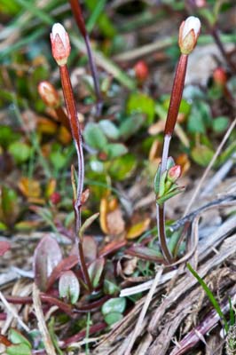 Erect open, creeping perennial herb 10-120 mm tall, base usually bearing sparse leafy stolons otherwise much branched; plants with broad strigulose lines decurrent from petiole margins, or strigulose all round near stem base, hairs appressed, occasionally erect. Leaves on petioles 1-2 mm long, opposite, alternate in the inflorescence, dull bluish-green, reddish green to bronze green, the lateral veins not prominent, 0-4 on each side of the midrib; lamina 5-10 x 1-3 mm, narrowly elliptic to linear, apex acute base attenuate, margins serrulate (rarely entire), with 0-4 teeth on each side. Inflorescence erect, the flowers scattered down the stem. Flowers erect. Ovaries 6-15 mm long, glabrous (or with broad strigulose lines of hairs running up sutures), on pedicels 3-27 mm long, these densely strigulose all around (pubescence extending to base of capsule thence stopping abruptly, very rarely with a few minute hairs on abaxial floral tube). Floral tube 0.5-1.5 mm deep, 0.7-2.2. mm diameter, glabrous or strigulose externally. Sepals 2.0-4.5 x 0.8-1.5 mm, not keeled, glabrous. Petals 2.8-3.0 x 1.8-2.2 mm, notch 0.3-0.7 mm deep; white. Anthers 0.4-0.9 x 0.25-0.5 mm, cream or yellow; filaments white, those of longer stamens 1-2 mm long, those of shorter stamens 0.5-1.5 mm long, the anthers of the longer stamens dehiscing first and shedding pollen directly on to the stigma after the flower opens. Styles 1.2-1.8 mm high, white; stigma 1.0-2.0 x 0.3-1.0 mm, white, clavate, surrounded by anthers of at least the longer and usually both sets of stamens at anthesis. Capsule 15-25 mm long, on greaty elongated pedicels 20-100 mm long (usually held well above subtending foliage); blue-green or reddish, glabrous to finely puberulent. Seeds 0.8-1.1 x 0.3-0.5 mm, pale orange-brown to orange, obovoid or narrowly obovoid, testa finely reticulate, apex distinctly, though narrowly, truncately beaked; coma 5-7 mm long, white caducous.